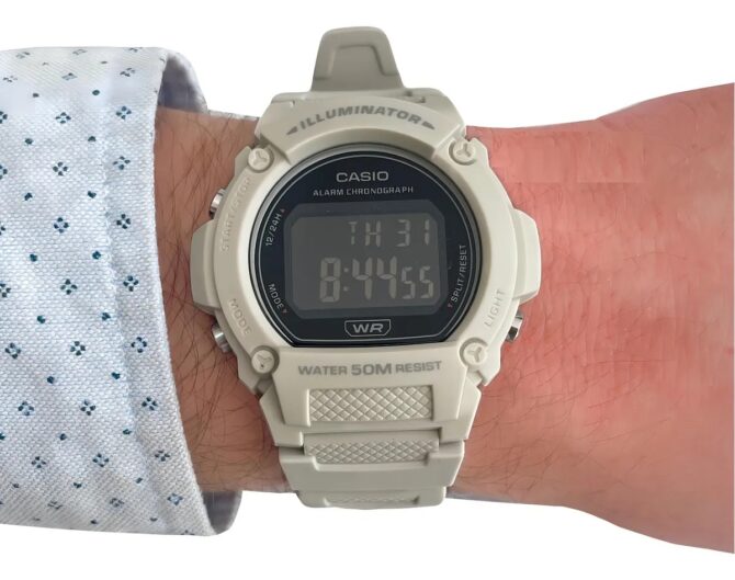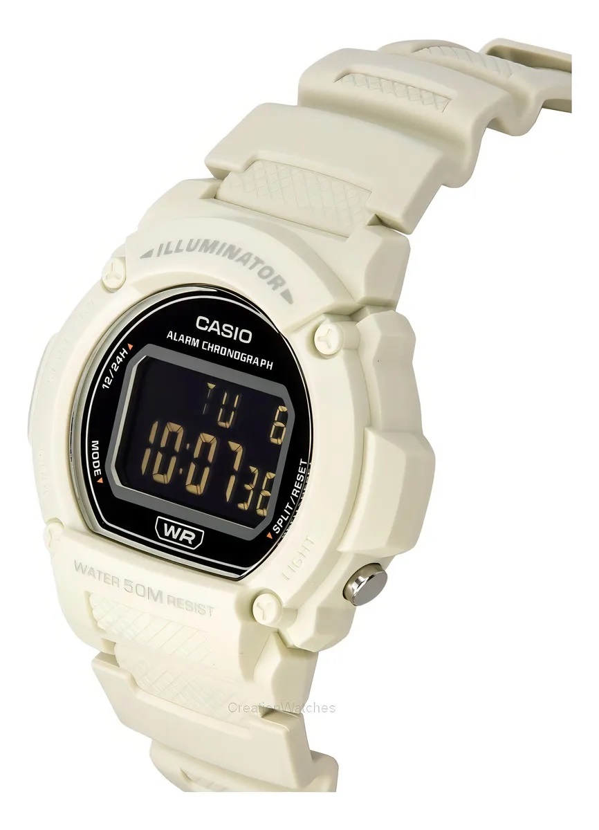 • Montre numérique Casio femme homme W-219HC-8BVDF, avec bracelet en résine blanche, cadran noir, étanchéité 50 m, alarme, chronomètre et éclairage LED. arque : Casio Référence : W-219HC-8BVDF