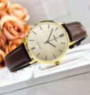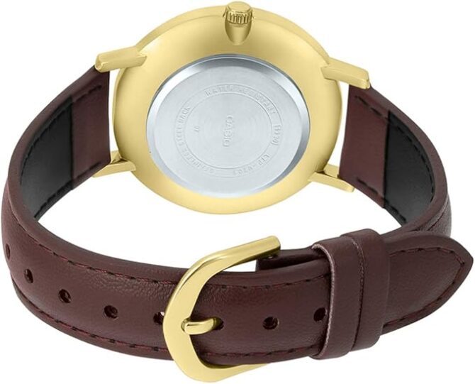 - Bracelet en cuir Boîtier plaqué or ionique Verre minéral Résistant à l’eau Affichage de l’heure standard analogique : 3 aiguilles (heures, minutes, secondes)
