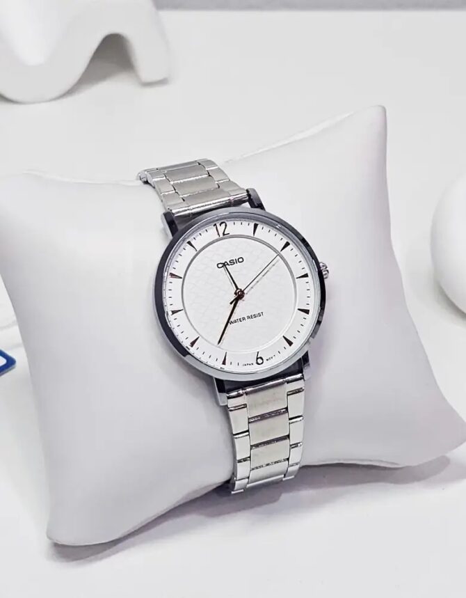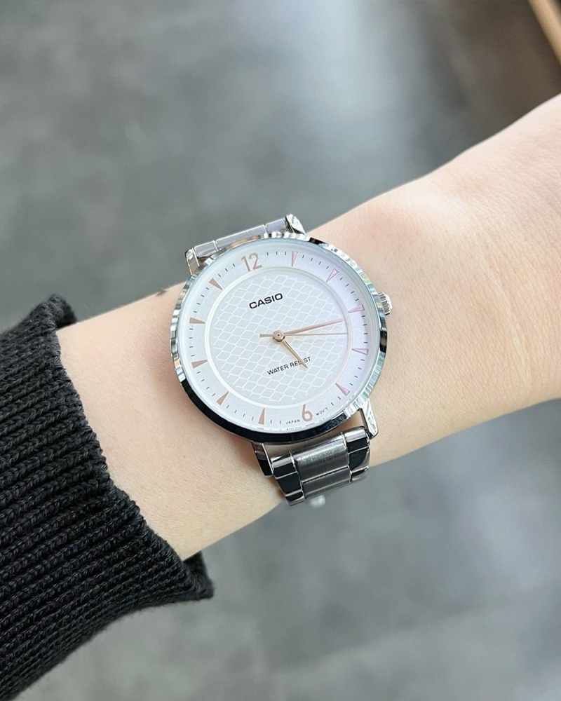 - cadran en verre blanc élégant avec motif maillé, étanche, dans la dernière collection Casio pour femme.