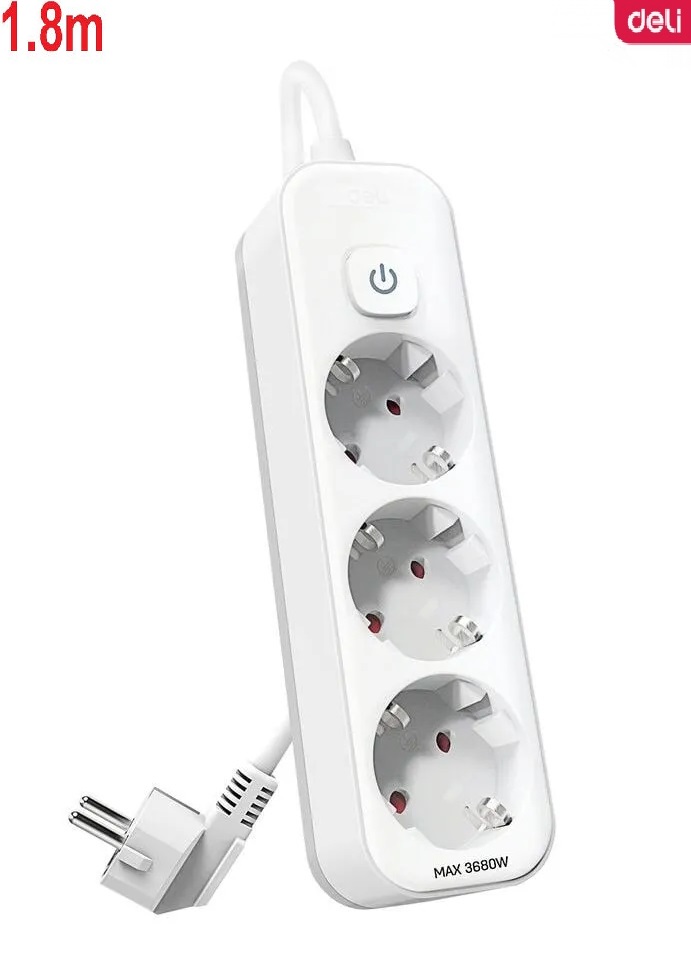 Deli Super Rallonge Multiprise 3 prises avec interrupteur câble 1.8M sécurité enfant 16A, 3680W