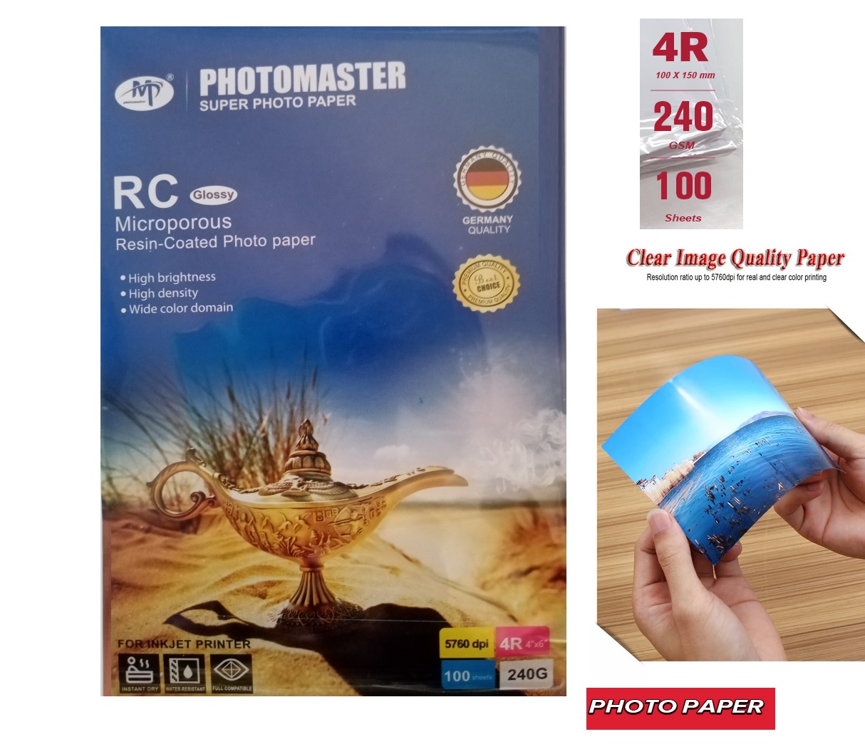 - Papier photo RC ultra blanc 240g GSM 4R (102x152mm) Le papier photo est RC (revêtement en résine) et résistant à l’eau.