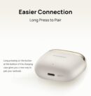 - Connexion simplifiée : une pression prolongée sur le bouton situé au bas du boîtier de charge vous offre une nouvelle méthode pour appairer vos écouteurs. Une fois appairés, les écouteurs se reconnecteront automatiquement à votre appareil à chaque ouverture du boîtier.
