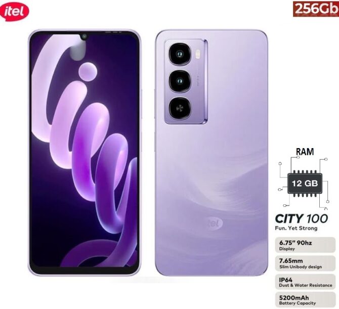 itel Smartphone City100 4.5G 6.75″ IPS LCD 256GB de stockage Ram 12Go (extensible de 4Go + 8Go) 5200Mah 13mpx-Pure titanium