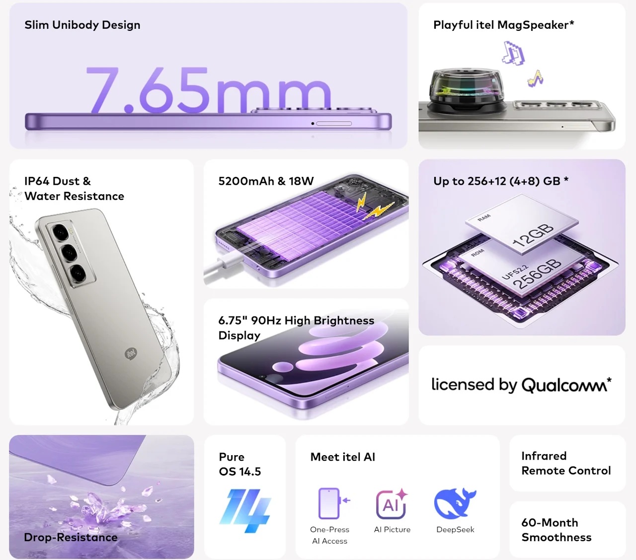 itel Smartphone City100 4.5G 6.75″ IPS LCD 256GB de stockage Ram 12Go (extensible de 4Go + 8Go) 5200Mah 13mpx-Pure titanium