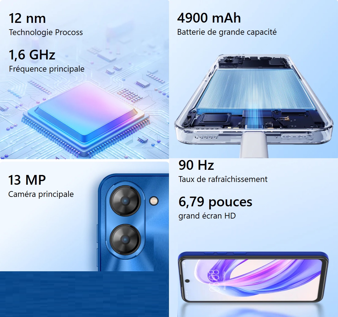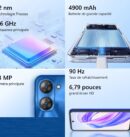 - GPU : ARM Mali-G57 MP1 Système d’exploitation : Android 14 Écran : 6,79 pouces HD, technologie TFT, taux de rafraîchissement de 90 Hz Caméra arrière : Double (13 MP f/2.2 + objectif auxiliaire)