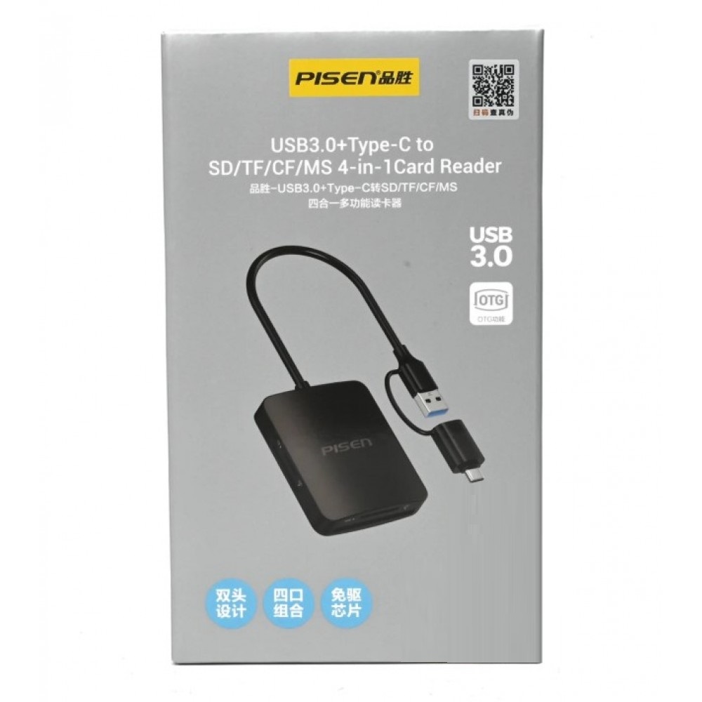 Pisen Lecteur de Carte mémoire Pro 3.0 (5 Gbps) 4en1 USB USB-C vers SD et Micro SD MS CF TF