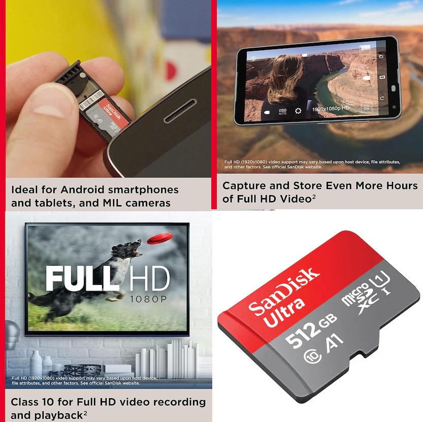 - Idéal pour les smartphones et tablettes Android et les caméras MIL Capacités allant jusqu’à 512 GB. Stockage utilisateur réel inférieur) pour stocker encore plus d’heures de vidéo Full HD (approximations ; les résultats et la prise en charge vidéo Full HD (1920×1080) peuvent varier en fonction du périphérique hôte, des attributs de fichier et d’autres facteurs.)
