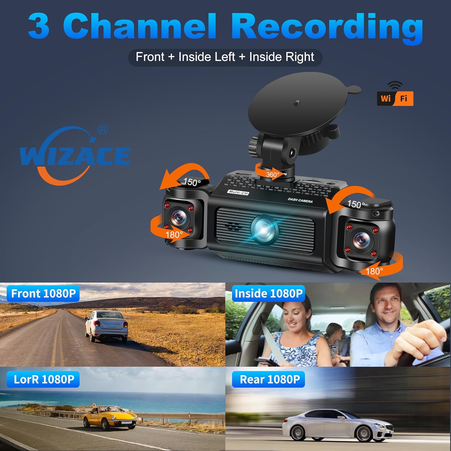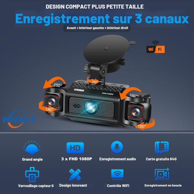Super Camera embarquee à 3 canaux WiFi FHD 2K caméra frontale à 270° pour voiture avec caméras frontales et latérales gauche et droite