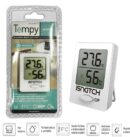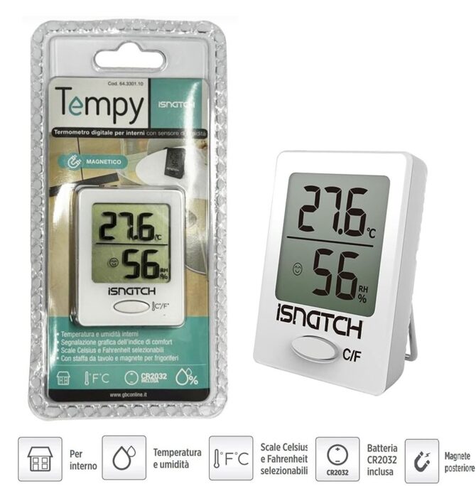 Thermomètre-hygromètre numérique d’intérieur « TEMPY » avec capteur d’humidité – Blanc. Ce thermomètre-hygromètre numérique d’intérieur affiche la température et l’humidité. Il dispose d’un affichage graphique de l’indice de confort. Un aimant à l’arrière permet de le fixer sur des surfaces métalliques, comme un réfrigérateur. Un support est également fourni pour les surfaces planes. Sélection manuelle des échelles Celsius et Fahrenheit. Pile CR2032 incluse.